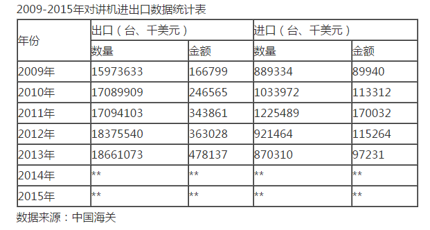 2009-2015年对讲机进出口数据统计表